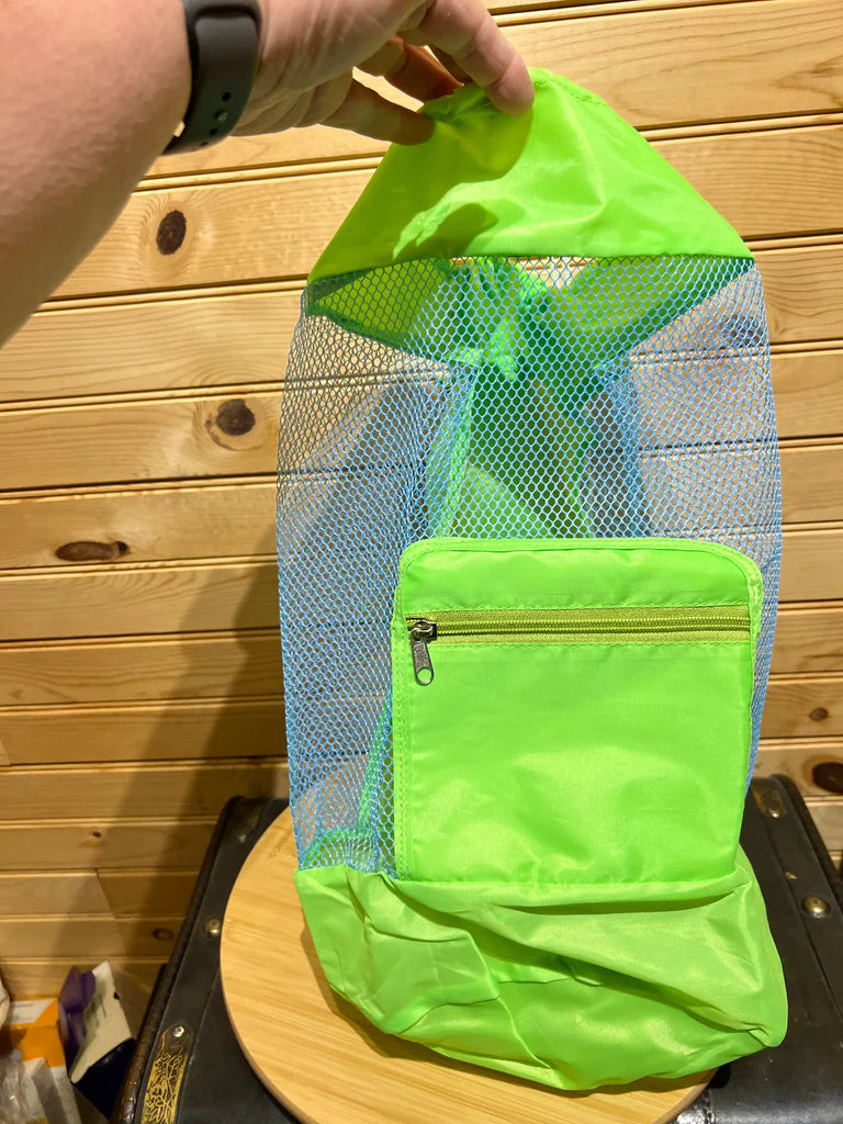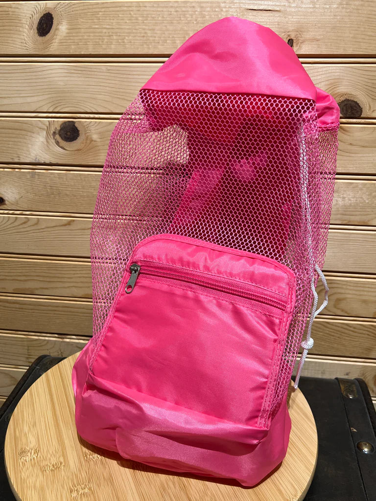 Summer beach days couldn't get any better with this fun Mesh Backpack! Crafted with a nice mesh and ripstop material, it easily folds into a pocket for easy storage and portability. Its 18” tall and 10” diameter give you all the room you need for the essentials, so you can relax and enjoy the sun!