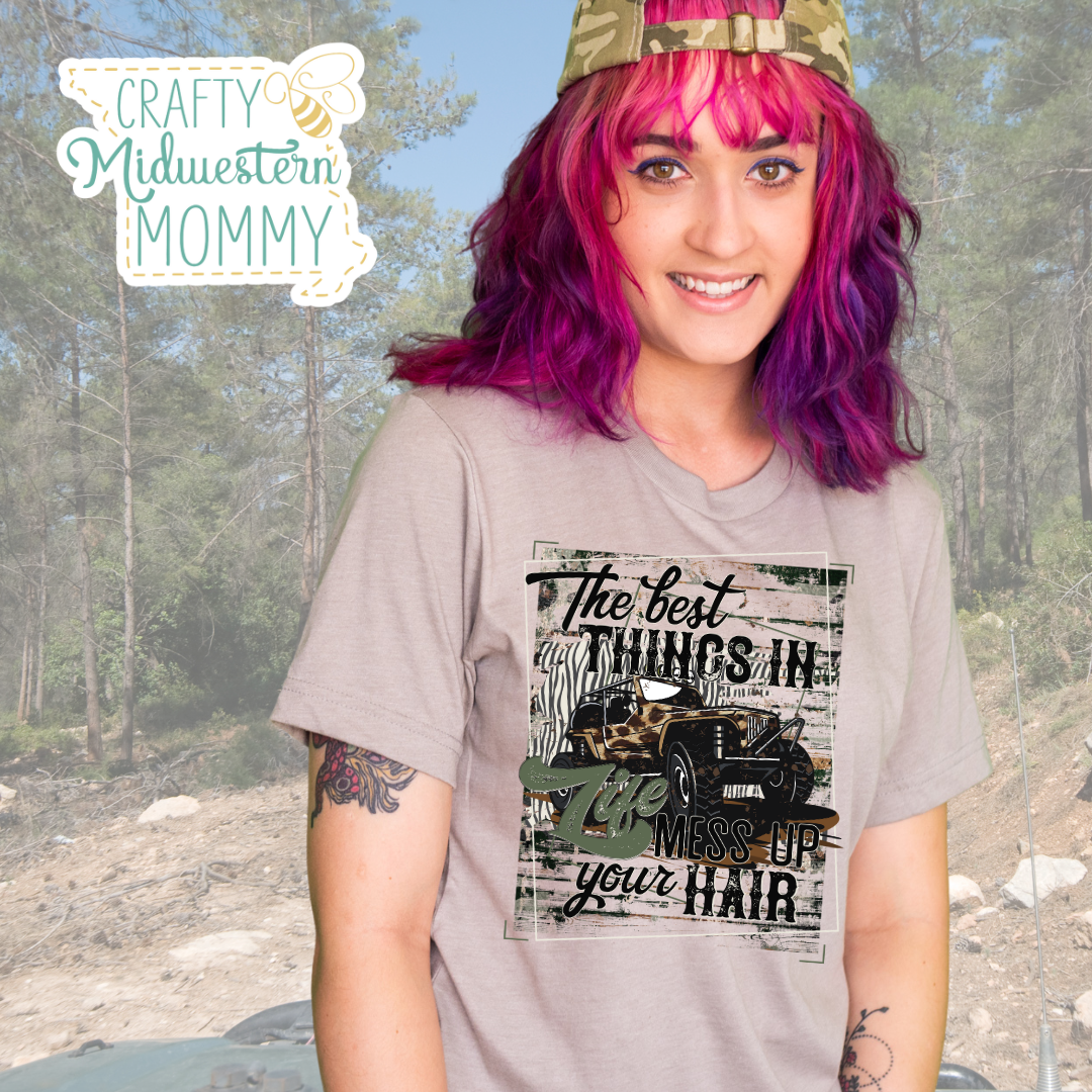 Embrace the wild side with our Best Things In Life Off Road Graphic Tee. Perfect for off road enthusiasts, this tee features a playful reminder that the best things in life always mess up your hair. Let loose, have fun, and show off your fun-loving attitude with this comfortable shirt. (Guaranteed to turn heads!)