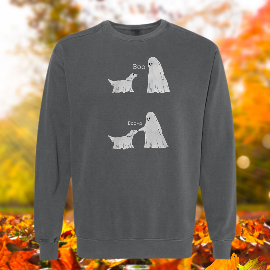 Get cozy and spirited with Boo, Boo-P Comfort Colors Crewneck. This sweatshirt features a playful ghost and dog design that's sure to bring a smile to your face. Made with comfort in mind, it's perfect for snuggling up in on a chilly day. Boo-yah!