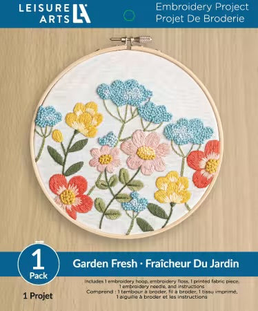 Leisure Arts Kit Embroidery 6" Garden Fresh - Embroidery kit contains: 6" embroidery hoop, 8 floss colors, pre-printed fabric, a needle, and instructions. Design is pink, yellow, blue, and coral flowers with green stems and leaves.