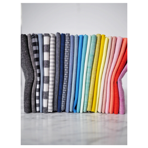 This bundle includes 24 fat quarters of Kona Cotton, Linens, Wovens, and Chambrays, in a range of bright colors and some neutrals.