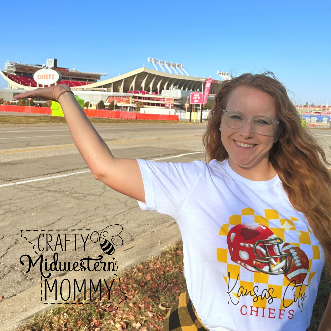 Show off your love for KC football with our retro graphic shirt! Featuring a fun red & yellow design of a helmet and football, this shirt is perfect for game day or any casual outing.