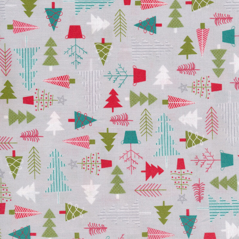 Cup of Cheer by Kim Christopherson of KimberBell for Maywood Studio is a colorful collection full of classic Christmas motifs. Get ready for the holidays with this fun tree farm fabric showing a variety of colorful trees on a grey background.