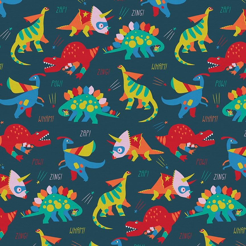 POW! ZAP! ZING! This prehistoric collection packs a mighty punch! Designer Liz Mytinger has always loved dinosaurs, and thought “what could be cooler than SUPERHERO dinos?” Well, the answer is whatever you sew using this collection! Inspired by retro comic book art, this fabric would make the best bedroom decor for any kid, or kid at heart. Sew a super-cute crib quilt and matching plush doll, some DIY curtains for a nursery, or the perfect gift for any of the the dinosaur or comic nerds in your life!