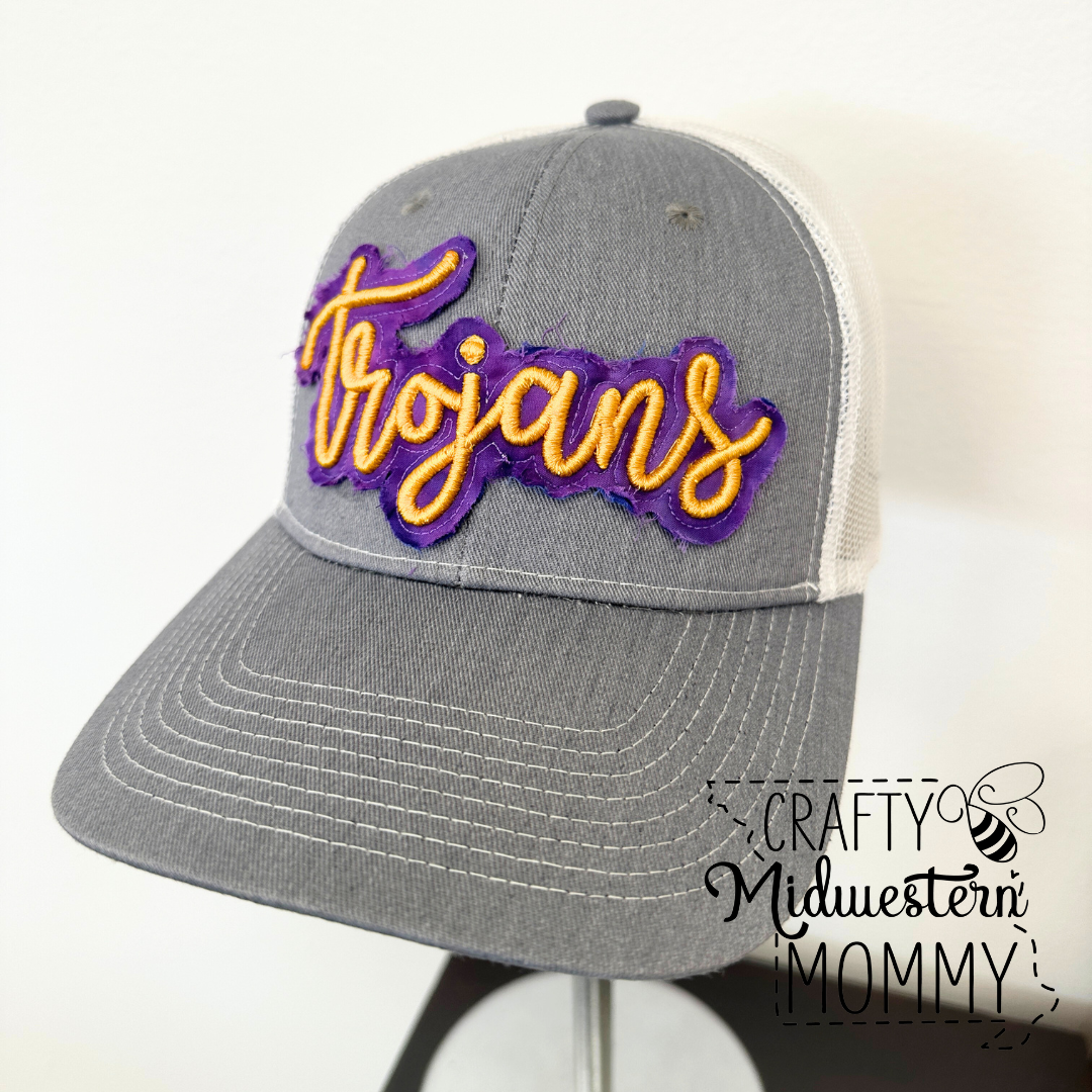 Show your school spirit for our local Troy Trojans with this cool hat! These hats are Richardson 112 snapback trucker hats with a 100% polyester mesh back. You choose your hat color for the purple patch applique & gold puff embroidery.