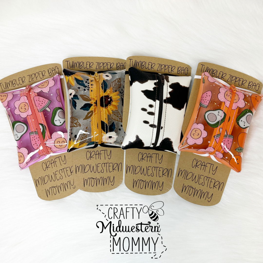 These zipper bags are perfect for many different types of tumblers & cups because they are made with adjustable elastic. They are great for holding credit cards, lip balm, keys, ear buds, and any other small items you want to keep near. Use it at the pool, gym, or anywhere you need to store just a few items hands free. Each bag measures about 3.25" wide & 4.5" tall.