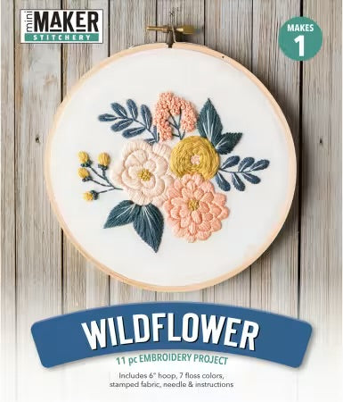 Leisure Arts Kit Embroidery Make In A Weekend 6" Wildflowers - Design features a cluster of flowers and leaves. Kit includes: 1 wooden embroidery hoop, 7 embroidery floss colors totaling 37 yards, 1 printed 9"x 9" fabric piece, 1 needle, and instructions.